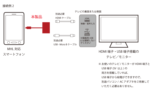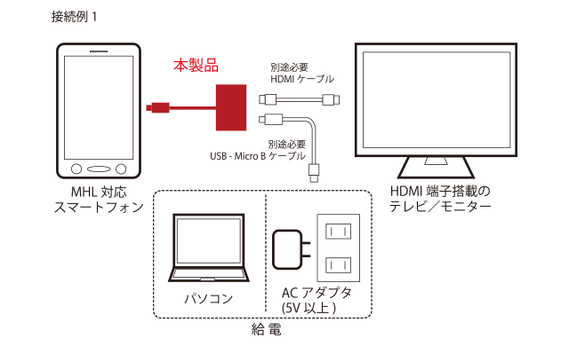 本アダプタの使用には、本体のUSB Micro B端子に、パソコンまたはACアダプタからのUSB Micro Bケーブルを接続して給電する必要があります。同時にスマートフォンの充電が可能です。